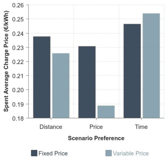 A comparison between the fixed charging prices and the proposed variable charging prices model are shown in Figure 8. As can be seen, the proposed model presents advantages in all scenarios for the EVs users in terms of charging prices. When the user distance preference scenario is considered, the proposed model presents 4% of gains for users’ (0.0083 €/kWh), for price and time user preference scenario the benefits are 10% (0.0210 €/kWh), and 2% (0.0046 €/kWh), respectively.