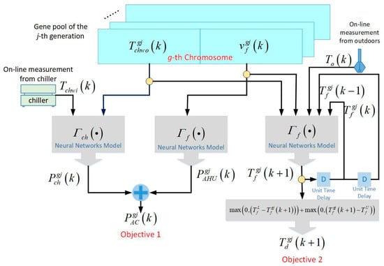 The objective functions or fitness functions for NSGA-II are evaluated at every k-th time step. Let the sampling interval be , NSGA-II is applied to obtain the best optimal solution from the convergent Pareto-optimal solution within the sampling interval . Note that is normally set to be 10 to 15 min that is long enough for the NSGA-II to search for the best optimal solution. The corresponding fitness value of every chromosome is evaluated using the FNN proposed in Equations (14)–(16). Referring to (7), is evaluated by calculating and using the FNN models and as shown in (14) and (15), respectively. Referring to (11), the second fitness function is evaluated by first predicting at the next time step using the FNN model as shown in (16). Note that the temperature difference is calculated based on the predicted signal according to (11). Denote and as the optimization variables encoded in the g-th chromosome of the j-th generation, and as the corresponding fitness values. Assume that there are G chromosome in the gene pool and it totally takes J(k) generations for the NSGA-II to obtain convergent Pareto-optimal solutions at the k-th time step. The calculation of fitness values corresponding to every chromosome in the gene pool is illustrated in Figure 2. It is shown in Figure 2 that the power consumptions of chillers and AHUs denoted as and , respectively, as well as the predicted AHU outlet cold air temperature denoted as , are estimated through FNN models based on and in every g-th chromosome. However, the chilled water inlet temperature of chiller and the outdoor temperature are obtained through on-line measurement and remain constant in every generation until NSGA-II achieve best optimal solution for the k-th time step.