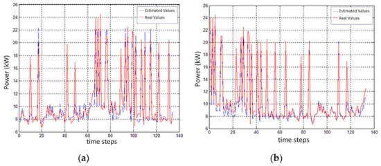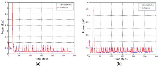 Comparison of chiller power consumptions between estimated and real values for (a) chiller 1; (b) chiller 2.