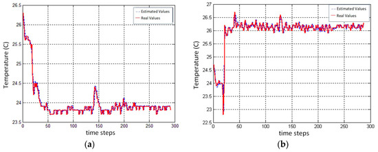 Comparison of predicted and real AHU outlet cold air temperature for (a) AHU 1; (b) AHU 2.