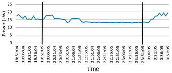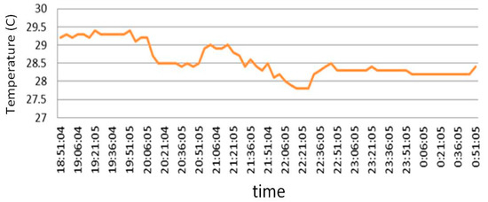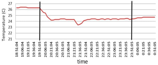In order to signify the effectiveness and efficiency of the proposed energy saving control scheme, the control scheme was applied from 19:50 to 23:50 on a typical summer night. It takes about 120 s in every sampling interval for the energy saving controller running the proposed multi-objective optimization and returns both optimization variables and at every time step on a personal computer with Intel® Core™ i7-8700 CPU @ 3.20 GHz. The variation in outdoor temperature is shown in Figure 6. For the convenience of illustration, vertical black bars are added in Figure 7, Figure 8, Figure 9 and Figure 10, showing the start and end of the control interval. It is shown in Figure 7 that the AHU outlet cold air temperature started dropping a few minutes after the control scheme was applied at 19:50 and went up a few minutes after the control scheme was terminated. Figure 8 shows that the variations in calculated by the proposed multi-objective optimization approach and the ones practically measured in the field. It is shown in Figure 8 that the measured values did follow the calculated ones.