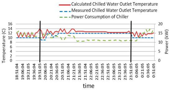 Calculated and measured chilled water outlet temperature and chiller power consumption.