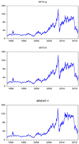 As shown in Figure 1, which shows the spot and futures price of WTI and futures price of BRENT for 1988–2016, the historical price of spot and futures prices of crude oil in the UK and the USA have had enormous fluctuations since 2007, which coincided with the beginning of the Global Financial Crisis (GFC). Thus, analyzing the correlations and spillovers between crude oil markets and financial markets seems to be very useful for making investment strategies.