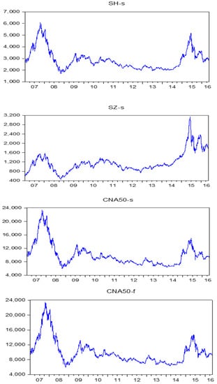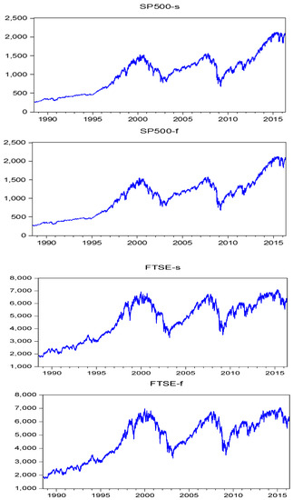 The spot and futures price of S&P 500, and the spot and futures price of FTSE 100 for 1988–2016 are shown in Figure 2, while the spot prices of SSE Composite, SZSE Composite, China A50, and futures price of China A50 for 2007–2016 are shown in Figure 3. The USA and China are the world’s two largest economies and the UK is the world’s sixth largest economy (and second in the existing EU) behind the USA, China, Japan, Germany, and India. Moreover, the USA and the UK are associated with WTI and Brent oil, respectively.