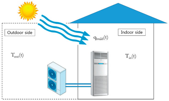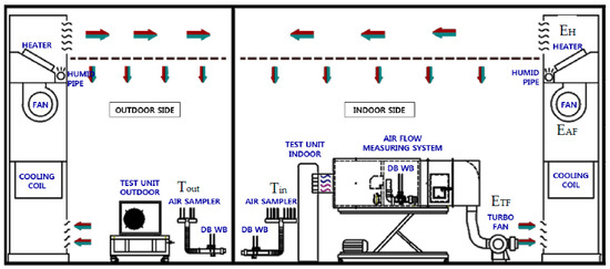 Unlike the (Tout/Tin) environmental setting of the ISO test methodology, we used the temperature in the outdoor side and the building cooling load in the indoor side (Tout/qbuild). In other words, we set the temperature of the outdoor side for a simulation of the heat reservoir outside and applied the cooling load condition in the indoor side for a simulation of the heat infiltration or generation. Tout and qbuild were provided time-dependently. In the test setup, Tout(t) was realized by a cooling coil and heater at the outdoor side, while qbuild(t) was implemented by a heater at the indoor side, as shown in Figure 2. The largest difference was that the cooling coil at the indoor side did not operate and the refrigeration function was operated only by the indoor test unit (air-conditioner indoor unit). Therefore, the temperature of the indoor room was decreased by the operation of the air conditioner while the target temperature was set. The wall of the test room minimized heat penetration and air leakage from the outside with the use of a sufficient thermal insulation material; the relevant test room specification is described in Section 2.2.