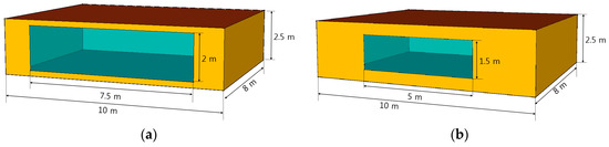 The TRNSYS program (version 17) was used to obtain the building cooling load for the cooling periods. We applied the meteorological data of Seoul and Riyadh for several years embedded in the TRNSYS program. TRNSYS (TRaNsient SYSTem Simulation), which is widely used as a building load calculation program, was developed by SEL (Solar Energy Lab) of University of Wisconsin, USA. The calculation algorithm of building load in TRNSYS is based on ISO 13790 and ISO 7730. Simulation for estimating the heating and cooling load on the building was performed through type 56. A multi-zone building analysis module of the TRNSYS program. Multi-zone module includes building properties such as geometric dimensions and wall configuration data and windows. In this module, the heat transfer by conduction, convection and radiation, heat gains were calculated considering the presence of occupants and equipment, and the storage of heat in the room air and building mass. Furthermore, it is possible for the temperature, solar radiation, bearing etc. to multi-zone module by applying a Meteonorm climate (for 20 years average temperature). Based on the transfer function method, a dynamic thermal energy analysis was performed in consideration of various types of complex heat gain occurring in space and associated radiation, convection, heat storage and heat dissipation of equipment [16,17]. The TRNSYS energy rate control method was used to analyze the seasonal building cooling load. Modules of type 15-2, type 56, TRNSYS three-dimensional (3D) plugin and Google SketchUp were utilized. We set a single zone of the same size in Seoul and Riyadh; however, the size of the window was set according to each country (Figure 4). The architectural style changes according to the life and environment aspect, and various studies are being conducted on this [18,19]. However, the comparison in the form of the same building is likely to be suitable for comparing the energy consumption by the type of air conditioner of this study. The Saudi households typically use small windows to block direct solar radiation. The properties of glass and wall materials were applied by referring to the Korea’s architectural regulation notice and Saudi’s paper [20,21]. The room temperature in the TRNSYS simulation was set to 26 °C, which was the same as the air-conditioner temperature setting during the experiment. The recommended room temperature is different for each country. In the case of Korea, 26 °C is recommended according to the "Ministry of Land, Infrastructure and Transport", and 23–25 °C are recommended according to the government guidelines in Saudi Arabia. For an equal comparison, we set the temperature as 26 °C in this study [20,22].