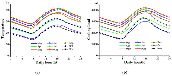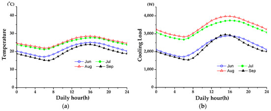 (a) Seoul outdoor temperatures; (b) Seoul building cooling loads obtained by the TRNSYS simulation.