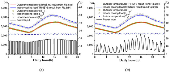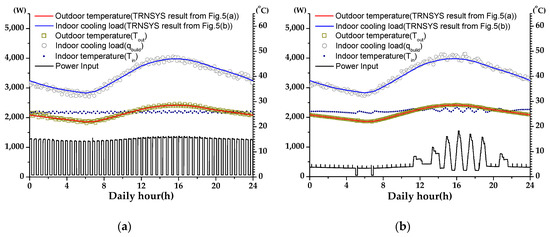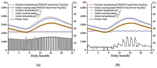 Figure 7, Figure 8 and Figure 9 show experimental results for comparison of the constant-speed and inverter air conditioners. The indoor building loads and outdoor temperatures were consistent with the TRNSYS simulation results (circle points and rectangular in the figures). The indoor building loads were experimentally implemented through the heater at the upper end of the AHU, as shown in Figure 2, where the powers of other heating elements (e.g., AHU and turbo fans) in the indoor side were simultaneously measured and the test was controlled by the AHU heater. The dotted lines with small oscillations represented the indoor room temperature which varied in the range of 26.0 ± 1.5 °C as the test product temperature was set at 26 °C. Both the constant-speed and inverter air conditioners were automatically operated during the experiments and only the indoor building load and outdoor temperature were applied according to the TRNSYS simulation results.