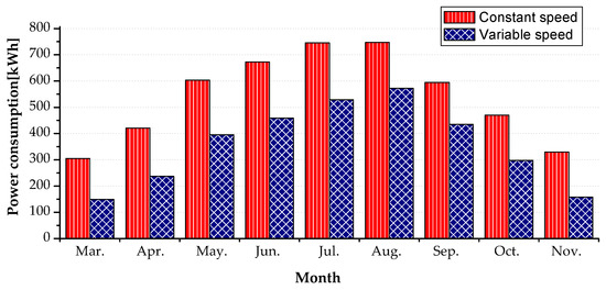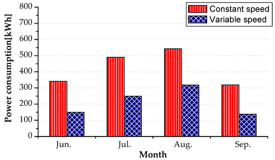 The power inputs in the above graph could be averaged to obtain the daily average power consumption. Table 6 shows the monthly power consumption, obtained by multiplying 30 (days) with the daily average power consumption. During the cooling seasons of Seoul (four months) and Riyadh (nine months), the monthly power consumptions of the constant- and variable-speed air conditioners were compared (Figure 10 and Figure 11). Considering the air conditioners’ specifications in Table 5, the variable-speed air conditioner had a higher EER than that of the constant-speed air conditioner by approximately 5%. Therefore, the relative difference was subtracted by –5% in Table 6. In Riyadh, the variable-speed air conditioner has a smaller energy consumption by 18.3% in August and 47.1% in November. This implies that the variable-speed air conditioner provides a higher energy saving than that of the constant-speed air conditioner in the part-load condition. Seoul in August is less hot than Riyadh (Figure 5a and Figure 6a), which leads to a larger energy saving (36.3%) of the variable-speed air conditioner. In Saudi Arabia and Korea, total inverter energy savings of 28.9% and 44.5% were achieved during the cooling season, respectively. These results were very similar to those in the study for Istanbul and Saudi Arabia, where energy savings of 11–38% and 22–50%, respectively, were obtained for an inverter air conditioner in a real office usage [6,8].