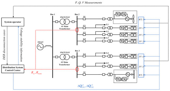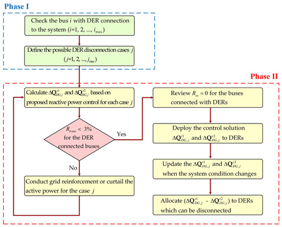 The second phase determines the proper reactive power generation for each DER by the voltage sensitivity analysis. It verifies all possible cases, and it calculates at the buses with DER in the distribution system. In South Korea, the technical regulation of DER interconnection to the distribution system requires to be less than 3% of its nominal value. If it exceeds 3%, the grid reinforcement or active power curtailment of each DER is unavoidable. After the proposed method checks whether satisfies this requirement, it commands the DERs to produce the reactive powers, and , by which the for the possible DERs disconnection is minimized. Then, when the system condition due to the disconnection of DERs is changed, the proposed method directly updates the matrices of and to minimize the voltage variations.
