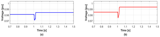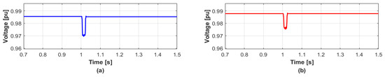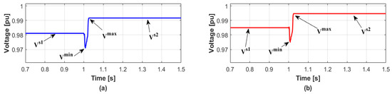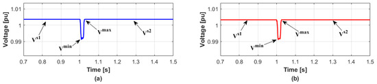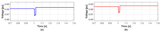 When several DERs are disconnected at the same time, the simulation results are given to validate the proposed reactive power management method which minimizes the voltage variation. In detail, when the WT1 and WT2 are disconnected simultaneously at 1 s, the voltage variation in transient condition is shown in Figure 4 while the DERs do not generate reactive power. The values of and in bus 2 are 1.06% and 2.10%, and those in bus 3 are 0.97% and 1.99%, respectively. On the other hand, the proposed method calculates the values of reactive power compensations ( and ) by Equation (13). Then the proposed method also distributes the reactive power generations to DERs in each bus in proportion to the capacity of each DER by Table 1. In this case, total reactive power generations for each bus are 5.61 MVAR and 4.15 MVAR, respectively. After distributing the reactive power generations, the and can be significantly reduced as shown in Figure 5. The values of in buses 2 and 3 in Figure 2 are 0% and 0.01%, and the values of are 1.24% and 1.22%, respectively. The reason the values of for both buses are similar is because the identical type of DERs with the same capacity has disconnected. The results are summarized in Table 4.