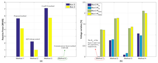In the same manner, the proposed method calculates the reactive power generations to DERs by Equation (13) and Table 1. In this case, total reactive power generations for each bus are 1.02 MVAR and 0.47 MVAR, respectively. After distributing the reactive power generations, the and can be significantly reduced as shown in Figure 8. The values of in buses 2 and 3 are 0.02% and 0%, and the values of are 1.66% and 1.33%, respectively. The voltage variations in Figure 8 is not much different from that shown in Figure 7. The reason is that the of Figure 7 is close to zero without the reactive power compensation. Bus 2 has the higher rate of than that of bus 3 because the larger amount of DER is disconnected in bus 2. The results are summarized in Table 6.