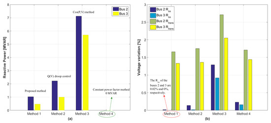 Total reactive power outputs from the DERs by four methods are shown in Figure 9a. Also, it is observed from the result of Figure 9b that the excessive reactive power compensation does not always contribute the voltage stability of the system. The method 3 of Figure 9b has the highest value of voltage variation even though the DERs generate the largest amount of reactive power. These results show that the proposed method yields the best voltage stability among four methods with the minimum reactive power generation. The validity of the proposed method is verified for the same type of the DERs disconnection in Cases 1 and 2.