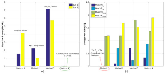 Comparison results for minimization of voltage variation in Case 2. (a) Total reactive power generation at buses 2 and 3 (b) Voltage variation at buses 2 and 3.