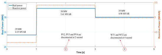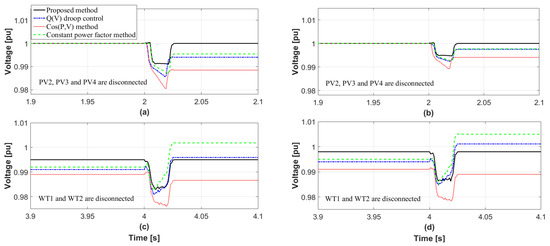 As mentioned before, numerous situations of DER disconnection were simulated to prove the performance of the proposed method. However, the voltage sensitivity of the “Y” substation with respect to the reactive power generation of DERs is not changed in the previous cases. To verify the effectiveness of the proposed method when voltage sensitivity varies with respect to reactive powers, several load changes are assumed in the “Y” substation, as shown in Figure 13. Total sum of initial real and reactive loads is set to 29 MW and 4.15 MVAR, respectively, as described in Table 2. First, the total load is increased to 38 MW and 5.41 MVAR at 1 s. Then, the load is decreased to 35 MW and 4.98 MVAR at 3 s, respectively. The disconnection of DERs occurs twice after each load change, as shown in Figure 13. PV2, PV3 and PV4 are disconnected at 2 s, and WT1 and WT2 are disconnected at 4 s. Please note that the transformer tap changer regulates the system voltage closer to 1 pu before the first disconnection occurs at 2 s. The proposed reactive management method recalculates voltage sensitivity when the load changes, and it determines proper reactive power outputs to each DER. It is clearly shown that the proposed method further minimizes the voltage variation than other methods, as shown in Figure 14. For example, for the disconnection of PV2, PV3 and PV4, the proposed method assigns the reactive power generations at buses 2 and 3 as 0.85 MVAR and 0.69 MVAR, respectively. Then, the values of in buses 2 and 3 become zero, and the values of are 0.94% and 0.56%, respectively. Likewise, for the disconnection of WT1 and WT2, the proposed method assigns the reactive power generations at buses 2 and 3 as 0.90 MVAR and 2.28 MVAR, respectively. Then, the values of in buses 2 and 3 also become zero, and the values of are 1.20% and 1.17%, respectively. Please note that the system voltage for all methods is changed after the first DERs disconnections, as shown in Figure 14a,b. Nonetheless, the proposed method can recalculate the appropriate reactive power generations of DERs by voltage sensitivity analysis and hence it guarantees the minimum voltage variations, as shown in Figure 14c,d. On the other hand, the performance of the other methods are inconsistent with respect to the different system condition. When the WT1 and WT2 are disconnected, the cos (P,V) method shows the best performance for minimizing voltage variations among three conventional methods. However, when the PV2, PV3 and PV4 are disconnected, the cos (P,V) method shows the worst performance for minimizing voltage variations. The results are summarized in Table 9 and Table 10.