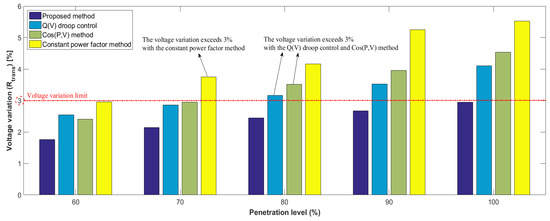 Total reactive power outputs from the DERs by four methods are shown in Figure 6a. Then, Figure 6b clearly shows the relationship between and , where the gets smaller as the value of goes to zero. In other words, both voltage variation can be minimized when is zero. Consequently, this result shows that the proposed method provides the very powerful solution to minimize the voltage variation for the severe contingency such as the sudden disconnection of DERs.