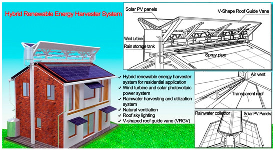 Equipping a building with efficient renewable energy (solar, wind, and rainwater) is one of the effective ways to solve the issues of high energy consumption and pollution in modern cities. Previous researchers have indicated that about one-third of the global carbon dioxide emissions are related to residential and commercial buildings [23,24,25]. The application of the renewable energy concept in architectural design is attracting people’s interest, as researcher such as Yang et al. conducted a research on applying solar energy, wind energy, and rainwater on a house to achieve a high economic and ecological value [26]. Consequently, Chong et al. proposed a hybrid wind–solar–rain utilization system with a power augmentation guide vane (PAGV) for high-rise building applications, where the PAGV guided and increased wind speed into the wind turbine to improve power performance of the wind turbine that was installed in this system. According to the calculations that were undertaken, the system produced or saved a total of 160 MWh of electricity per year [27,28]. Moreover, the PAGV was able to act as a mounting bracket for solar panels and also acted as a rainwater harvester to reduce the electricity consumption of the high-rise building. In addition, building roof is considered to have a great potential for adopting renewable energy (wind, solar, and rain). Contino et al. investigated the possibility of a large-scale use of wind turbines combined with roof solar panels in rural and remote areas [29].