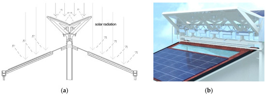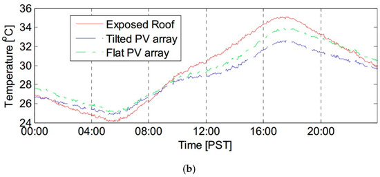 (a) Schematic diagram; (b) interior ceiling surface temperatures under exposed roof, tilted PV array, and flat PV array. Reprint with permission from Reference [56]; 2011, Elsevier.
