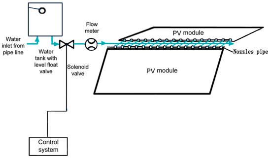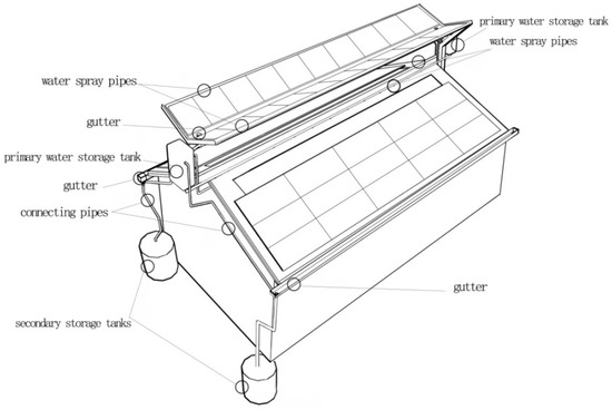 A rainwater harvester comprises two water tanks, drainage channels, water spray pipes, connecting pipes, etc. In this system, the VRGV also forms the flow path for the rainwater collection that leads towards the water storage tanks, as shown in Figure 5. In the current study, a simplified passive automatic cleaning and cooling system with a water spray function was used to increase the power generation efficiency of the solar PV modules (refer to Figure 6). Sixteen equally spaced copper nozzles are applied in this cleaning and cooling system to maintain a uniform cleaning and cooling effect of the solar PV modules. According to the experiments conducted by Elnozahy et al. [57], the power generation efficiency (11.7%) of the cooled and cleaned solar PV modules was 2.7% higher than that of the solar PV modules without the cooling and cleaning system. Figure 7 shows the efficiency of the PV module with and without the cooling system.