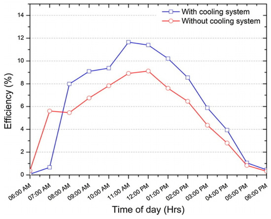 Photovoltaic efficiencies of the PV modules with and without the cooling system. Reprint with permission from Reference [57]; 2015, Elsevier.