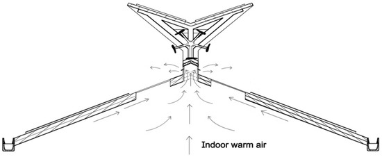 Along the ridge of the building, a heat rejection air vent is adopted to exhaust warm air from the building, as shown in Figure 9. When wind flow blows through the area between the VRGV and the double-pitched roof, the wind can be accelerated, creating a low-pressure area, while the warm air in the attic possesses a higher pressure. Natural convection occurs due to the pressure difference between the attic and the area where the VAWT is located. A simple computational fluid dynamics (CFD) analysis was implemented to research on the pressure distribution between the VRGV and the double-pitched roof. The result showed that the night ventilation cooling effect of a windowed building equipped with this hybrid renewable energy harvester system (air vent) was 2.9 °C, assuming an average outdoor temperature of 30 °C and an outdoor temperature fluctuation of 5 °C [58]. Additionally, rainwater is prevented from entering the building by a series of side louvers along the air vent.