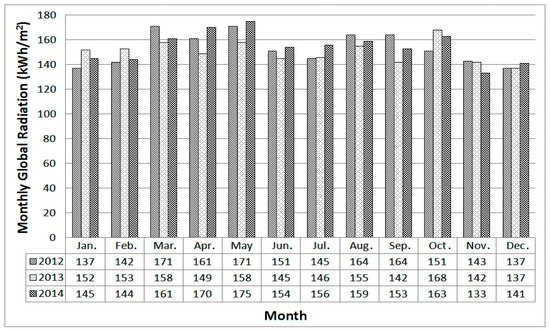 Monthly average solar radiation (kW h/m2) data of Subang, Malaysia (2012–2014).