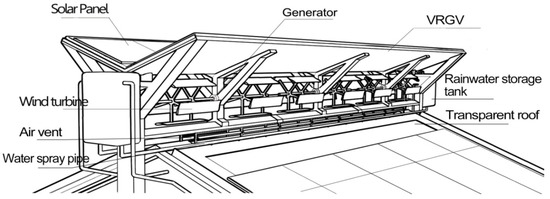 Solar panels can be strategically placed on top of the pitched roof and the VRGV, as shown in Figure 3. Solar panels are not placed on the part of the pitched roof where noon sunlight is blocked by the VRGV. The specifications of the solar PV panel are shown in Table 3.