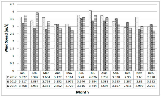 The increased wind velocity in the presence of the optimized V-shaped roof guide vane (VRGV) structure at the region of the wind turbine in Subang (m/s) (2012–2014).