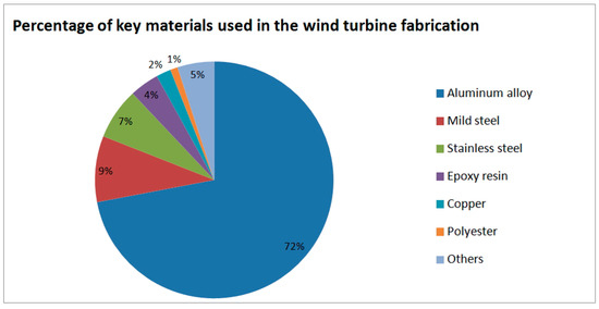 Consequently, is the carbon dioxide emission in the process of the wind turbine fabrication. The main components and required materials in the wind turbine fabrication are shown in Table 7 [68,69]. The percentage of the key materials used in the wind turbine fabrication is shown in Figure 15.