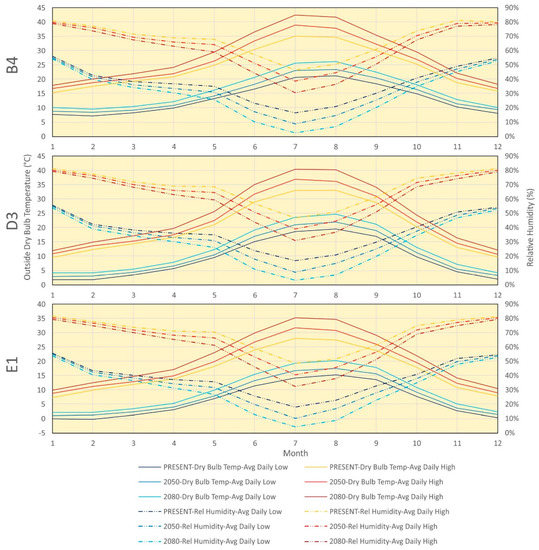 - Karimpour, M.; Belusko, M.; Xing, K.; Boland, J.; Bruno, F. Impact of climate change on the design of energy efficient residential building envelopes. Energy Build. 2015, 87, 142–154. [Google Scholar] [CrossRef]