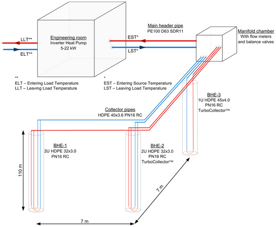 Therefore, the objective of the paper is to analyze the difference in steady-state heat extraction and rejection rates between different pipe types and geometry of the borehole heat exchangers in the same geological environment in a real project location. The main postulate of the research is the axiom that the novel TurboCollectorTM exchangers, with a ribbed inner wall, have a greater heat extraction and rejection rates due to lower thermal resistance or skin, because of the higher convective heat transfer between fluid and pipe wall. Furthermore, TurboCollectorTM exchangers should have lower pressure drops when turbulent regime is achieved, due to the lower required flow rate in pipes. This hypothesis is crucial to promote this novel design in the case of deeper drilling, where borehole heat exchangers work with more favorable ground temperature due to the positive effect of the geothermal gradient.