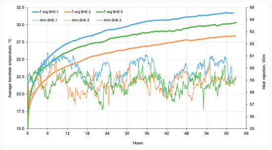 Figure 7 presents results of the extended thermal response testing. For each of the three boreholes additional fall-off tests were performed, by implementing additional lower heat power values until steady-state heat transfer was achieved for each of the steps (so-called Thermal Response Step Test—TRST). For each of the additional two heat steps, which lasted for 24 and 33 h, steady-state heat flow condition was observed. Such approach can provide confident information about dependency between two variables; borehole outlet fluid steady-state temperature in a function of heat pump evaporater/condenser peak load working conditions. Therefore, for any value of borehole heat rejection or extraction rate, stabilized fluid temperature in the borehole could be determined. This actually means that a borehole heat exchanger can work for a longer period without significant subsequent rise or drop in fluid temperature, depending on winter/summer regime.