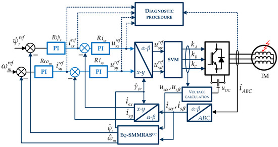 The diagnostic method analyzed in this paper and the speed estimator described above both operate under the sensorless direct field oriented control for an induction motor drive [46]. The block diagram of the control structure is presented in Figure 2. The main part of the control scheme consists of four PI controllers to control rotor flux amplitude, speed, and two stator current vector components in the synchronous frame depicted as x-y, rotating with rotor flux vector. The parameters of the PI controllers are shown in Appendix A. The reference rotor flux magnitude is equal to its nominal value or decreased under a field weakening operation when the speed exceeds the nominal value. Reference stator current vector components, the so-called flux-producing component and the torque-producing component, are set by flux and speed controllers, respectively. Reference voltage components, being outputs of PI current controllers, are transformed into the stationary frame α-β and then are used by the space vector modulation (SVM) to ensure the equality of the motor and reference voltages. The outputs of the modulator, kA, kB, and kC, which are the PWM signals together with the DC-bus voltage uDC, are used to calculate the actual voltage values usα and usβ and are used by the speed estimator. In this paper, it is assumed that the field-oriented control operates without taking into account the decoupling signals [9].