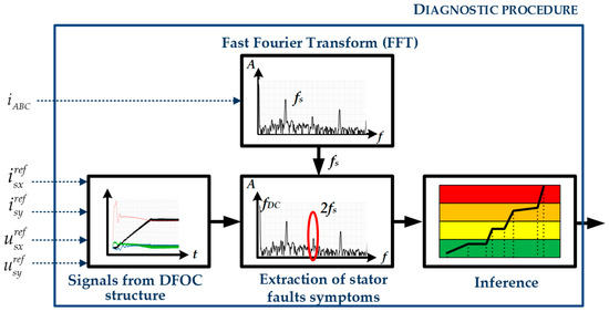 The proposed diagnostic procedure for a sensorless DFOC induction motor drive is shown in Figure 3. It is similar to the procedure presented in [9], however, the diagnostic signals used in this paper are different. Additionally, the control structure operates without a speed sensor and control paths decoupling. The diagnostic procedure can be described using the following steps: