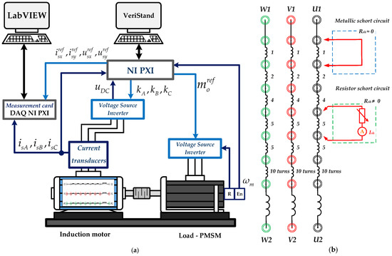 (a) Block diagram of the experimental setup and (b) the diagram of the induction motor terminals and modelled short circuit without (above) and with (below) additional resistor and ammeter. PMSM: permanent magnet synchronous motor, DAQ: data acquisition, NI: National Instruments Austin, TA, USA, PXI: Peripheral component interconnect eXtensions for Instrumentation