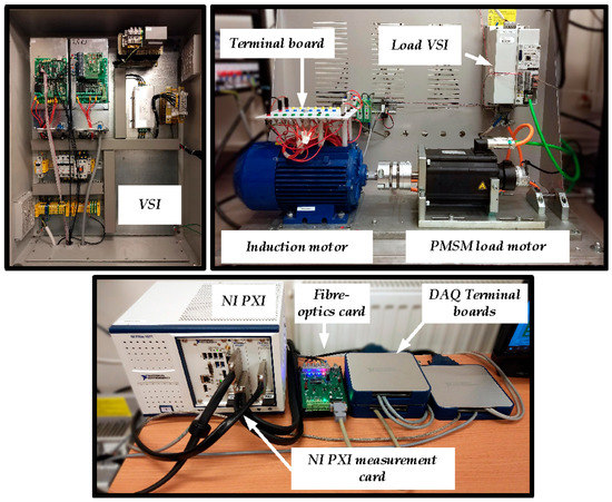 The parameters and the nominal data of the IM, used during the experiments, are shown in the Appendix A and Appendix B. IM is supplied by a voltage source inverter (VSI) that allows controlling of its switches using fiber-optic wires. The VSI is controlled with 10 kHz frequency by a modular rapid prototyping system, NI Peripheral component interconnect eXtensions for instrumentation (PXI) by National Instruments (NI), equipped with an field-programmable gate array (FPGA) card and a real-time system. Three phase currents and the DC-bus voltage are measured to perform control, estimation, and PWM modulation algorithms.