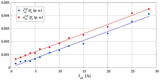 The influence of the short circuit current on the diagnostic signal value is verified in Figure 6 for five shorted turns in phase A. As can be seen, in order to limit the current of the short circuit, additional resistance can be used (for Rsh = 0 Ω, Ish ≈ 28 A). Short-circuit resistance grows along with a decrease in the short-circuit current. Moreover, it can be seen that the dependence of the diagnostic signals (both current and voltage) on the short-circuit current value is approximately linear. Thus, inferring about the motor condition and the quality of the diagnostic process can be significantly reduced (difficult) if the short-circuit is not metallic. However, when the current in the short-circuit circuit is relatively small, the damage is not so dangerous for the machine.