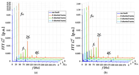 Except for the DC components, there are still some frequencies that can be observed in the reference x-axis current component: The fundamental supply voltage frequency fs, its multiples kfs, and the frequencies related to the slip speed (only in the case of the load torque presence, Figure 9b). The remaining frequencies are practically invisible and can be neglected in the analysis. As can be seen, the fs, 3fs, 5fs, and 6fs frequencies and the slip frequencies are independent of the level of the stator winding damage and cannot be treated as the indicators of the fault. On the other hand, only the amplitudes of 2fs and 4fs frequencies vary with the number of short-circuit turns and can be used in the diagnostic process. As was stated in Section 4, due to the highest sensitivity to the stator winding failure, the 2fs frequency amplitude is selected to be the fault indicator.