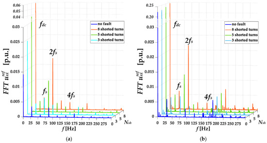 Spectral analysis of reference usx voltage with several short-circuit turns with ωm = 0.6 ωmN for (a) no-load operation and (b) nominal load operation