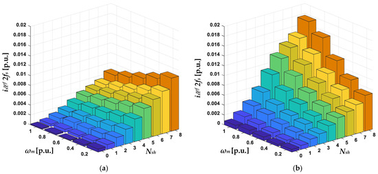On the other hand, Figure 12 presents the influence of motor speed on the second harmonic frequency of the reference x-axis stator current in the case of constant load torque. The dependence of the diagnostic signals is now stronger and changes relatively more than in the case of varying load torque and constant rotor speed. Additionally, the trends are entirely different between speed sensor usage (Figure 12a) and sensorless operation (Figure 12b). For the speed measurement, the diagnostic index decreases with the speed value, while in the case of sensorless operation this index increases. However, its value is still much bigger than in a non-faulty situation (Nsh = 0). Additionally, it proves that the value of the diagnostic signal cannot be taken directly as an indicator of the number of short-circuit turns (e.g., the value of 0.008 can indicate four short-circuit turns in the case of nominal speed and eight short-circuit turns for 0.2 ωmN). However, it can still be taken as an input of some neural-network based fault detector or used to determine the trend of the fault signature in time.