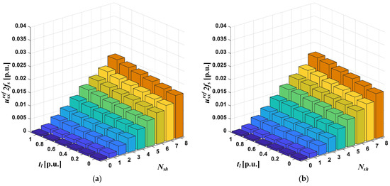Amplitudes of fsh harmonic of usx reference voltage component for different numbers of short-circuit turns and different load torques with ωm = 0.6 ωmN in the case of (a) speed measurement and (b) sensorless operation.