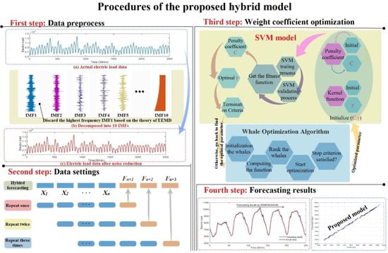 Based on the techniques discussed above, this paper proposes a method that combines data preprocessing techniques with optimization algorithms to improve the forecasting ability of SVM for electric load prediction. Procedures of the hybrid approach are shown in Figure 1. Original electric load data is first processed by the EEMD, which reduces noise in the raw time series to obtain more stationary data. The data after the noise reduction process is utilized for three-steps ahead forecasting, testing the forecasting ability of the hybrid approach. Next, as mentioned before, the accuracy of SVM depends highly on two key parameters, the penalty factor and the kernel parameter (γ, C). Whale optimization is applied to search these two parameters. Finally, forecasting results of each step are recorded for analyzation and comparison.