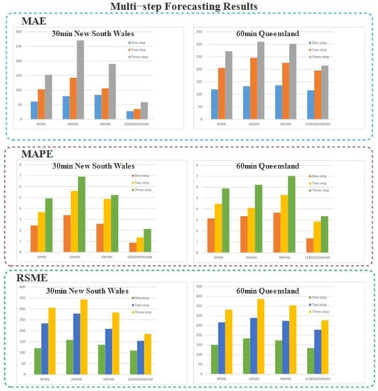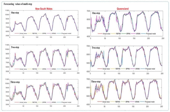 To further verify the effectiveness of proposed approach, multi-step forecasting was applied in the experiment. From Table 4 and Table 5, results of multi-step forecasting using data from two electric load stations are shown. For data in New South Wales, the MAPE values of three-steps forecasting are 0.8649, 1.3482, and 2.1361, respectively. For the data in Queensland, the MAPE values of three-steps forecasting are 1.3249, 2.8626, and 3.3396. In both power stations, the proposed method achieves better results in three-steps prediction.