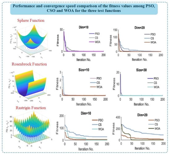 Performance and convergence speed comparison of the fitness values among Particle Swarm Optimization (PSO), Cuckoo Search Algorithm (CSO), and Whale Optimization Algorithm (WOA) for the three test functions.