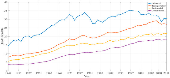 Energy consumption of industrial, transportation, residential and commercial sectors in the US since 1950 [2].
