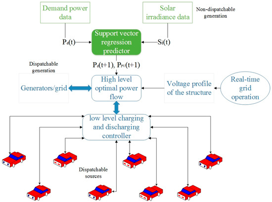 The present authors proposed an intelligent optimization framework in an EV aggregation to optimize the charge allocation of EVs and to stabilize the electric grid through reducing the power losses and voltage deviation [18,19]. They also proposed an optimal versatile control approach to regulate the voltage profile and reduce the power losses through V2G and G2V systems [3]. But the computational effort and response time for severe operating conditions remained challenging with such control strategies. For instance, as the proposed controller (ANFIS) is updated and retuned by an optimal power flow algorithm according to the new observation, the controller keeps EVs connected to the grid on standby for 45 s to retune the modifiable ANFIS parameters. This gap can be addressed by predictor algorithms. To achieve successful coordination, a bi-directional communication was suggested. This means that the architecture consists of a data collective section, collecting data on the state of power sources, including renewable distributed generation options and EV aggregation, and a predicting and optimizing section [20]. Indeed, an energy management system can utilize forecasted renewable power generation and demand information to schedule in advance the power flow of controllable resources such as PHEVs and/or EVs. Hence forecasting renewable energy sources such as solar energy (SE) and/or wind energy (WE), as well as demand characteristics, can be an important tool in activities of energy managers and electricity traders to overcome the risks related to energy planning and energy storage policies and to address economic dispatch or technical aspects. Furthermore, these steps provide valuable information regarding the time of operation, repair, and replacement of the system’s generators and conversion lines, which can be utilized to shift towards optimum electricity production.