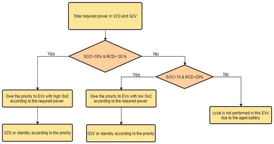 Figure 3 shows how the EVs are controlled individually by the low-layer of the controller. For instance, if an EV has a high SoC compared to other vehicles, it has the priority for V2G service if its relative capacity degradation is less than 20% of nominal capacity. Hence, a robust technique-based predictor is combined with an optimal power flow problem to estimate the required energy needed for grid stabilization. Then in the bottom layer, a controller schedules charging and discharging of a fleet of EVs based on the energy requested by the top-layer.
