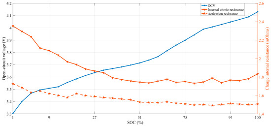 To extend the experimental data of the cell level to the battery pack level, the battery pack is modeled by the first-order model and its parameters were extracted from the Hybrid Pulse Power Characterization (HPPC) test by the recursive least square method. Figure 4 shows the behavior of internal Ohmic and activation resistances through different SoC windows. Afterwards the extracted parameters are embedded in the lookup tables, enabling simplification of the modeling of battery pack behavior and reducing the time use if a fleet of EVs is intended to be considered.