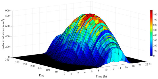 All simulations were run on a PC with 2.70 GHz Internal Core i7-6820HQ CPU and 16 GB of internal memory. The measured received solar irradiance on the horizontal surface for one year (8785 data points) are utilized. Figure 5 shows the solar irradiance dataset of the study located in Brussels, plotted in 24 h throughout the year. For the first step, the SVR was trained with the experimental data, depicted in Figure 5. Thereafter the SVR network was tested and evaluated via applying the common statistical indicators, the root mean square error (RMSE) with the forecasted and the actual test data. The inputs for the network are the temperature, relative humidity, and previous step irradiance data, collected from [37].