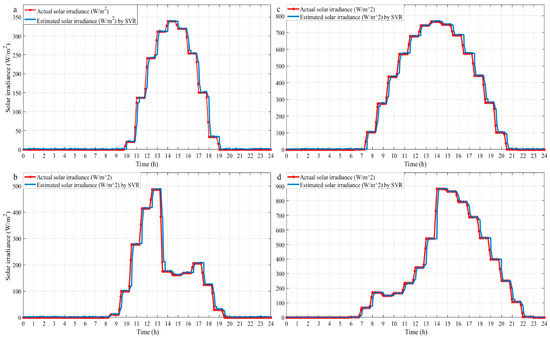 Figure 6 shows the prediction results of four days (1st, 50th, 100th, and 150th) of 2017, indicated by a,b,c, and d, respectively. The actual irradiance is highlighted by the red color, and the blue color indicates one-step-ahead prediction of irradiance. The horizontal axis is time, and vertical axis is solar irradiance (in W/m2). Figure 6 demonstrates that the SVR can predict irradiance accurately, showing its robustness and accuracy.